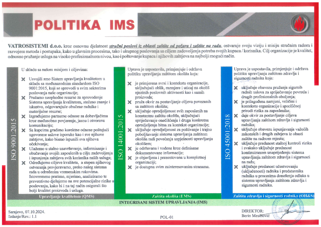 VATROSISTEMI d.o.o. Sarajevo primjenjuje integrisani sistem upravljanja koji obuhvata kvalitet usluga, zaštitu okoliša te sigurnost i zdravlje na radu. Sistem je usklađen sa međunarodnim standardima ISO 9001:2015, ISO 14001:2015 i ISO 45001:2018, čime osiguravamo pouzdanost usluga, odgovorno upravljanje resursima i sigurne uslove rada.